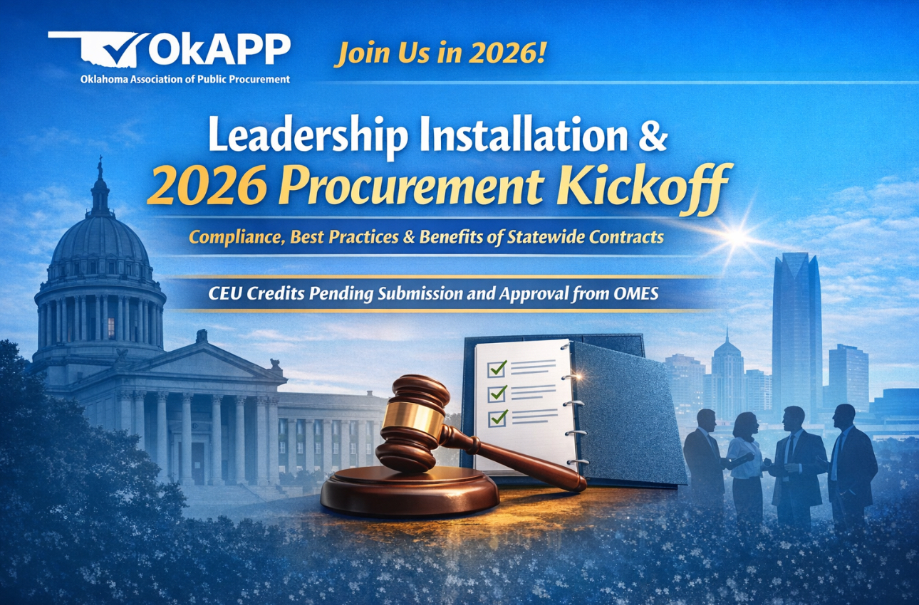Join procurement professionals statewide for the OkAPP Leadership Installation & 2026 Procurement Kickoff, featuring leadership installation and engaging training to start 2026 strong. This session will on compliance, best practices, and a proposed training topic on the Benefits of Statewide Contracts, highlighting how agencies can maximize value, efficiency, and consistency in public procurement.